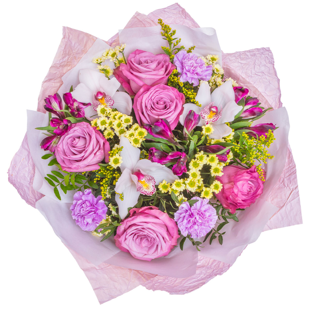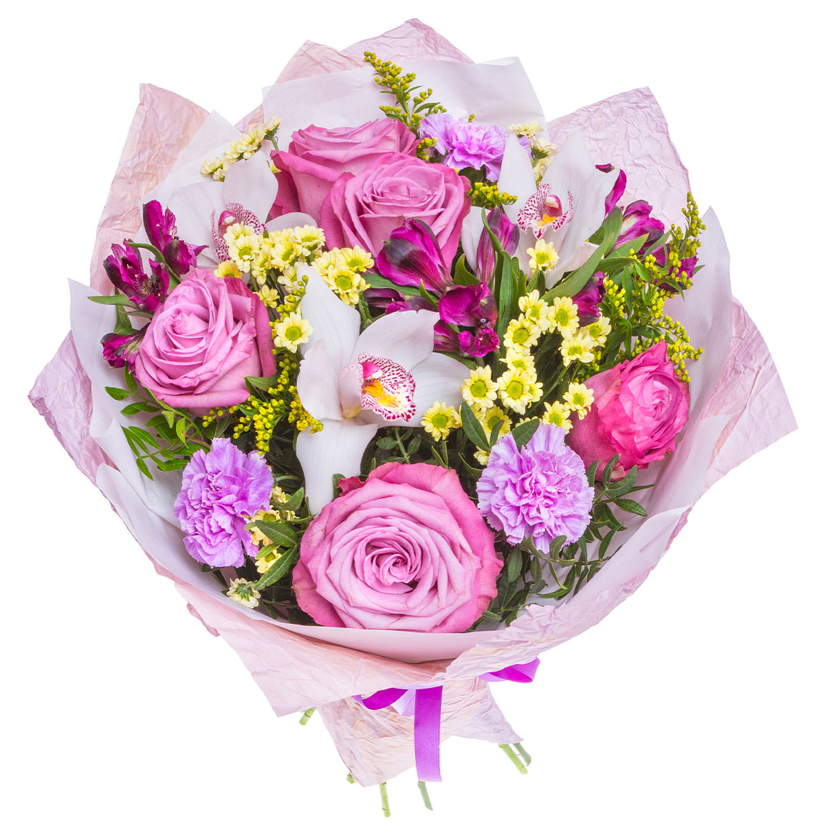 Роза одноголовая розовая, орхидея белая, гвоздика мини сиреневая, хризантема мини желтая, альстромерия сиреневая, солидаго, фисташка. Упаковка (лента, пленка, крафт, сетка, пленка матовая)